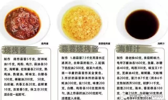 川椒粉60克,川椒碎80克,桂林酱100克,顶好酱40克,蚝油150克,生抽50克,老抽30克,糖60克,味粉50克,干葱、蒜泥各36克,金华油贝、海米泥各20克,大地鱼泥10克,三合油100克。
