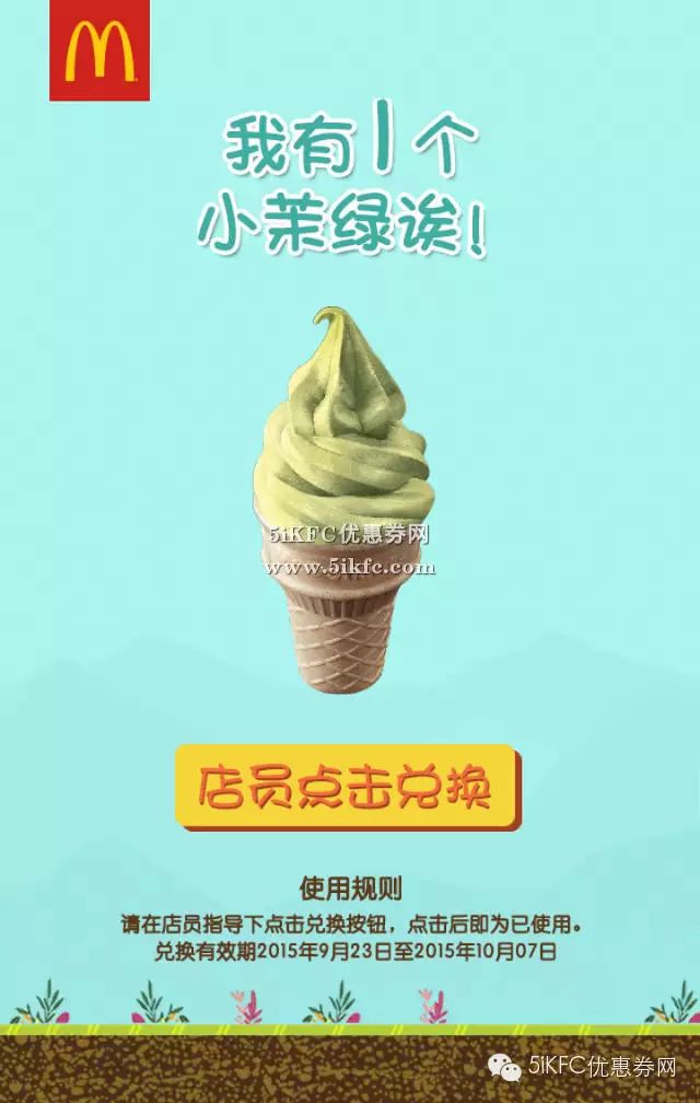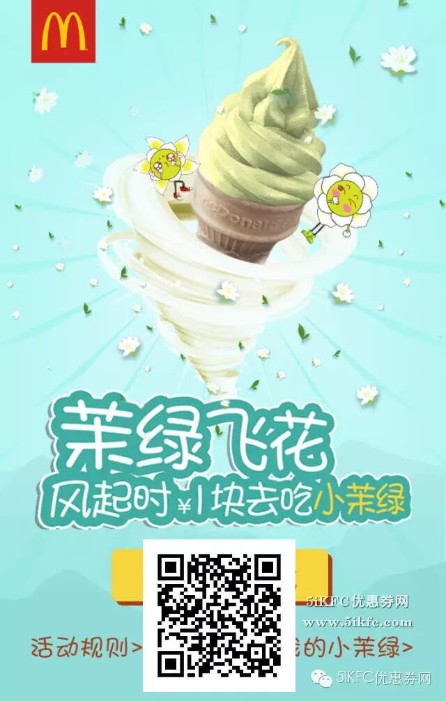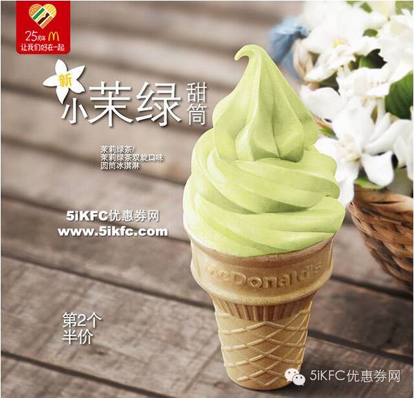 麦当劳1元甜筒活动,赢1元麦当劳新小茉绿冰淇淋!新品活动期间第二个半价哦!