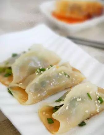 6. 包好的锅贴排放在平底锅内,先煎再煮最后煎到底部金黄酥脆即可。