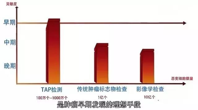第一、可早期发现肿瘤,TAP检测是目前灵敏度最高的肿瘤检测手段,能够更早的发现亚临床期肿瘤(肿瘤细胞<108)。癌变早期,虽然任何一种肿瘤标志物的变化都比较微小,不易被早期检测,但TAP检测,不是针对某个单一肿瘤标志物,而是在同一反应体系中,将二十多种与肿瘤密切相关的异常糖链糖蛋白进行一次性组合检测,集聚多种肿瘤信号,敏感度特别高,比影像学检查和传统肿瘤标志物的检查,都能更早地提示细胞恶变,是肿瘤早期发现的理想手段。