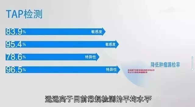 第三、准确度更高,经临床验证,TAP检测对临床确诊肿瘤患者的敏感度高达83.9%,对早期肿瘤的铭感度高达95.4%,对非肿瘤病人的特异度高达78.6%,对健康人群的特异性高达96.5%,远远高于目前常规检测的平均水平,可以大大降低肿瘤漏检率,可早期发现肿瘤;