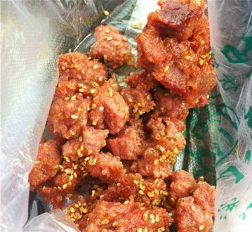 洪记当家招牌牛肉粒,排长队只为它,买好了直接上手,一口一个,淡淡的孜然味和牛肉嫩嫩的口感,外面焦焦的还有芝麻粒儿,这搭配简直了,嚼起来不费劲,凉了也好吃。同样解馋的还有羊肉粒、鸡肉粒和牙签肉,多备几样换着吃那叫一个爽歪歪。