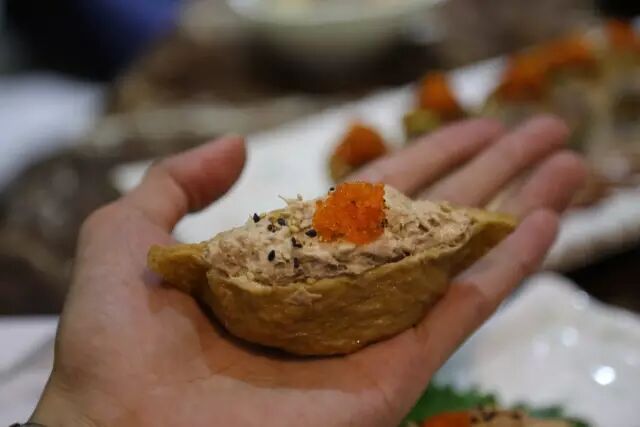 非常凑巧,当晚坐在字幕君隔壁的一桌人是这家店的脑残粉,果断抱大腿求着给推荐了一发店里最好吃的几样东西——龙卷、吞拿鱼福袋和炸豆腐。