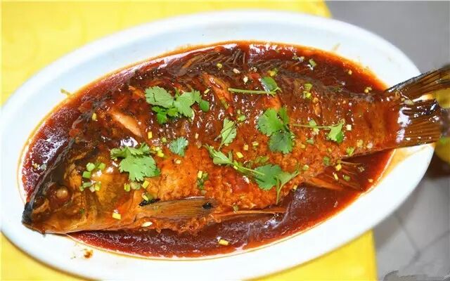 材料:鱼一只,姜末,蒜末,葱花,香菜,老抽,醋,料酒,糖,盐