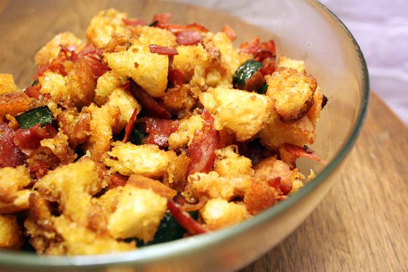 这道菜是以前西班牙牧人利用硬掉的面包做出来的,作法很简单,先把硬掉的面包切碎,放进水里面泡软,然后把爆香过后的大蒜、五花肉、腊肠、培根 .... 等和泡软的面包屑炒在一起。