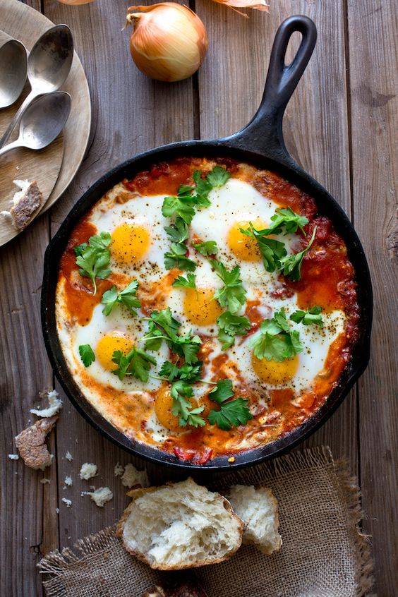 Shakshuka属于一锅到底的料理, 用橄榄油爆香洋葱与大蒜,将蔬菜碎与蕃茄碎炖烂以后, 再加入各式香料(特别是匈牙利红椒粉与孜然),最后再打进几颗蛋,将蛋煮至半熟,上桌以后搭配面包。