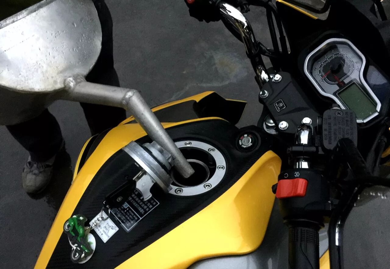 第一次加注,初始总里程为5km,油箱内有少量临时加注的燃油;加油13.39L,注平油箱口。