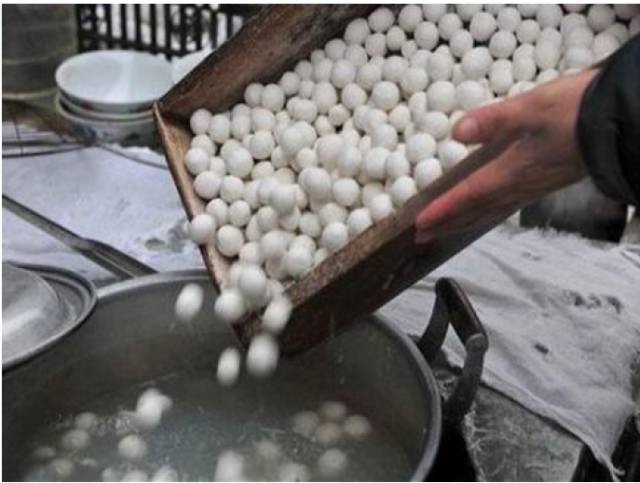 该下锅了,奶奶将这些用簸箕滚出来的小鳖鳖蛋宝宝们,一股脑放入冒着小气泡的开水中,用漏勺搅拌几下,便起锅了,这些鳖鳖蛋大小如一,光洁如玉。吃起来,醇香扑鼻,滑爽温润。