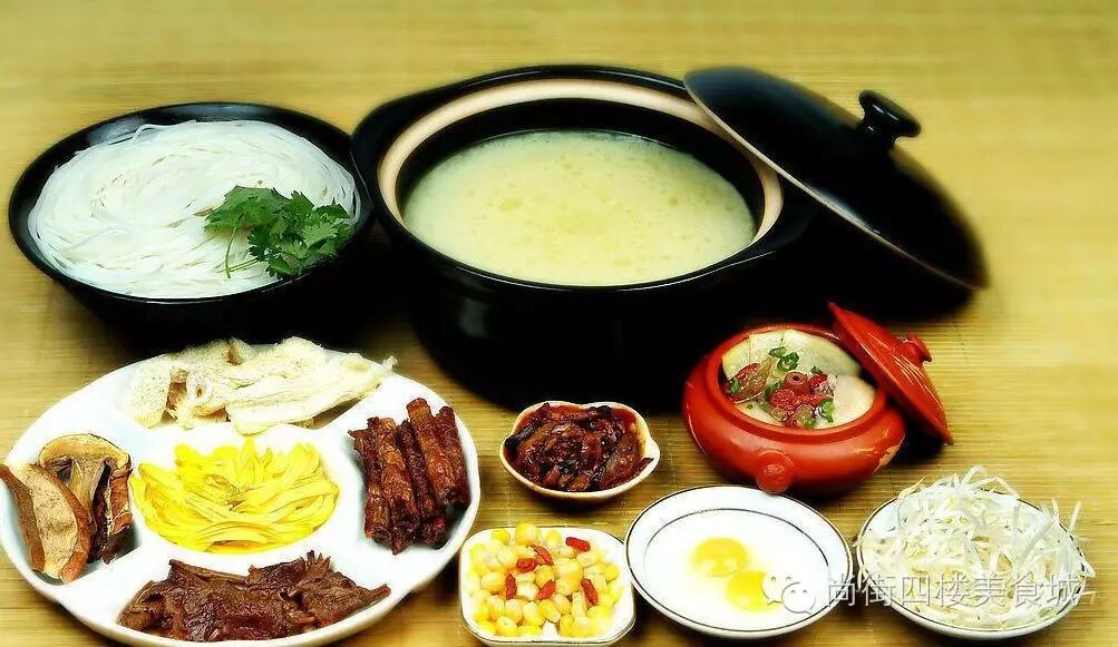 过桥米线所用高汤是用大骨、老母鸡、火腿经长时间熬煮而成的