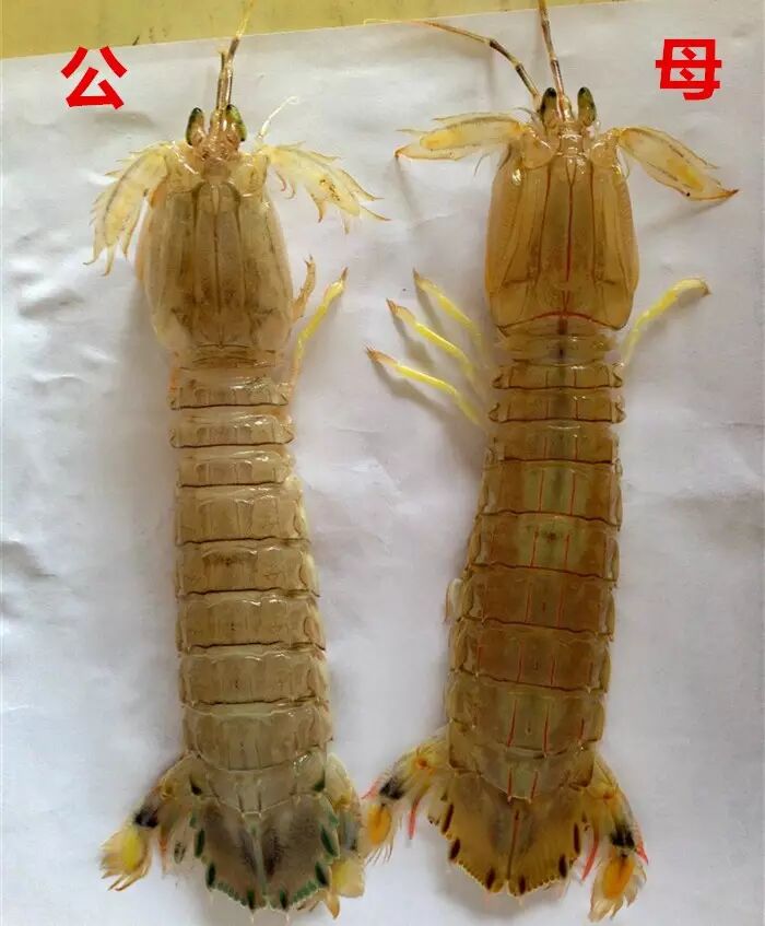 2、右边的一只是母的,注意看它头部往下的三对足之间的白色线,这就是人们所说的带“王”字的,看起来确实像一个“王”字。再就是看它的尾巴,尾部中间有一条黄线的,证明满仔啊。