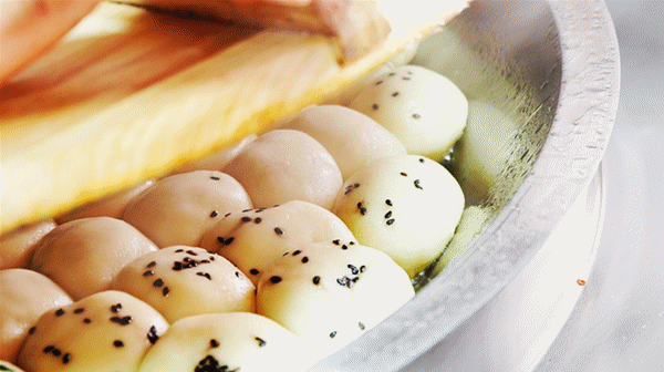 白嫩的生煎在慢慢成型,蘸了绿葱花,黑白芝麻,尤其玲珑可爱~