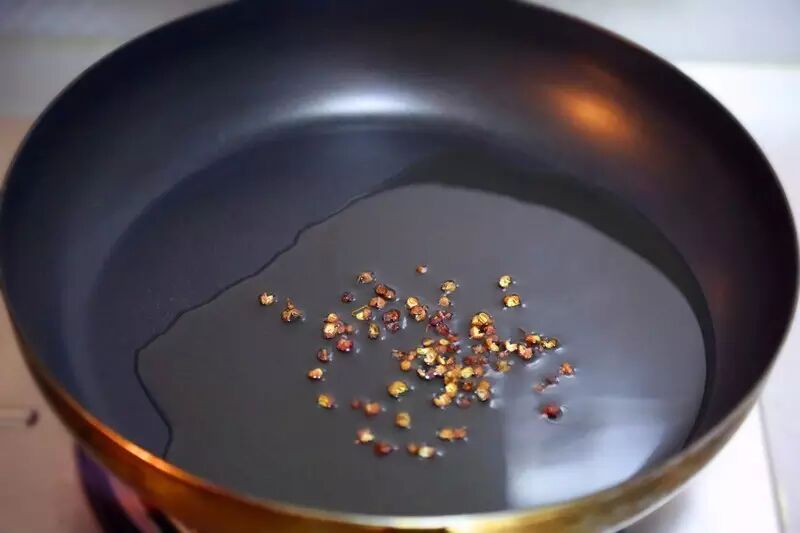 第十二步:锅中倒入少许油,油温六七成热的时候,将花椒放入锅中炸出香味。然后关火,将热油浇在碗里。