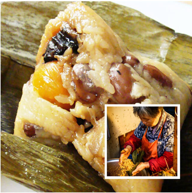 这是一种很特别的粽子,用来果腹极佳,味道有甜、咸两种馅料,里面的用料多到令人咋舌,光咸味的肉馅就有经腌制的南乳五花肉、香菇、虾米、腊肠、栗子、莲子等原料组合而成。