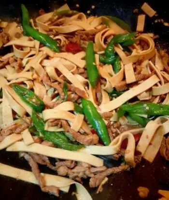 最后加入千张,加适量的盐调味,翻炒至千张入味即可