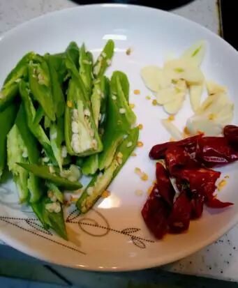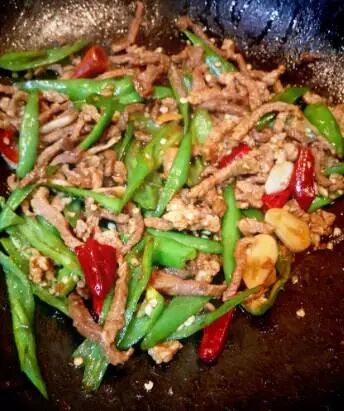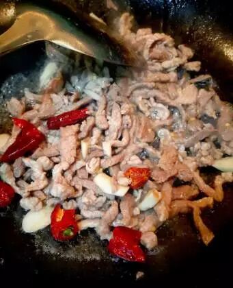 煮肉提前切肉丝,下油锅炒至变色后加一点点料酒,然后倒入蒜和干辣椒炒炒炒,香味出来就可以下一步