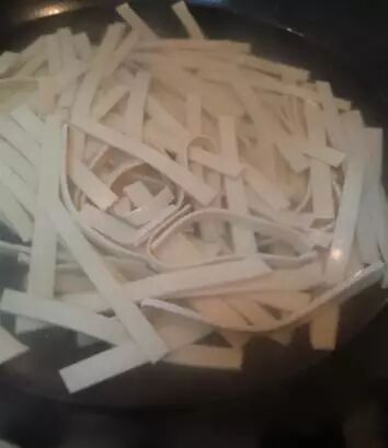 千张对半切一下,然后切条,冷水入锅焯一下水