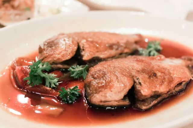 其貌不扬的一道菜,吃起来确实相当惊艳!「酱油水杂鱼」可是闽南人最喜欢的一种海鲜做法,但是我觉得这道菜似乎叫「酱油水炸鱼」更为贴切一点。微微下锅炸至表皮焦脆,在放入酱油水中卤煮入味,吃起来皮是脆的,内里确实相当的鲜嫩富有汁水。