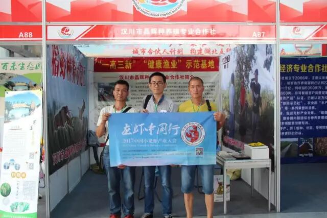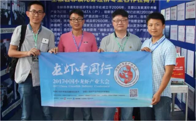 “龙虾中国行”与汉川市晶辉种养殖专业合作社谢国洪(左一)、湖北小龙虾养殖状元肖少辉(右一),2016年肖总亩产龙虾600多斤,成为当年湖北小龙虾养殖状元。