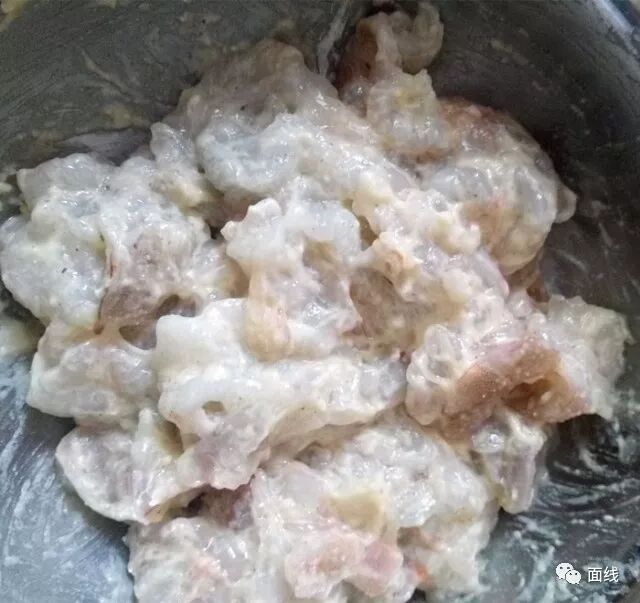 2、腌制虾仁,将盐、料酒、蛋清与虾仁混在一起搅拌均匀,再加入适量的淀粉,直至虾仁上面裹上了薄薄的淀粉外衣就可以了,然后放在一旁腌制约15分钟。