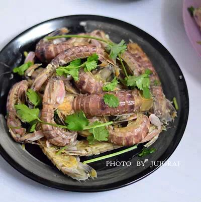 食材:虾爬子(500g)、花椒(10g)、蒜(10g)、姜(5g)、香菜(1小把)、盐(少许)