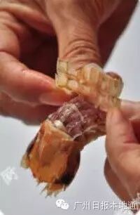2. 如图所示,尾部在前面,双手拿着爬虾,两个大拇指按住背部的壳,食指和中指将壳往外掰