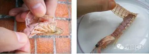 不停地左右晃动虾身,给它“松松身”,等虾身松动之后,咬掉虾头,从尾部开始往前剥壳。这种做法需要掌握合适的度,要多练几次才能成功。