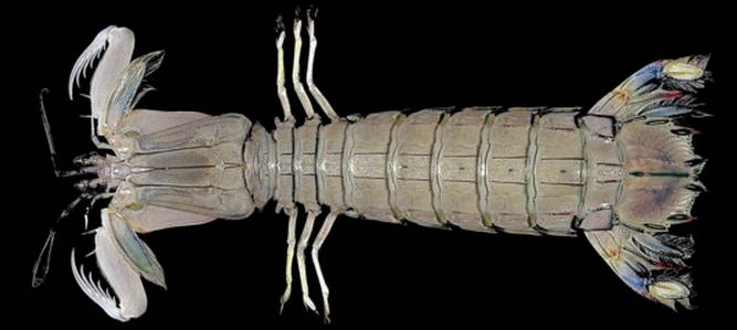 色彩艳丽的“亲戚”雀尾螳螂虾 (Odontodactylus scyllarus) 图 zh.wikipedia.org