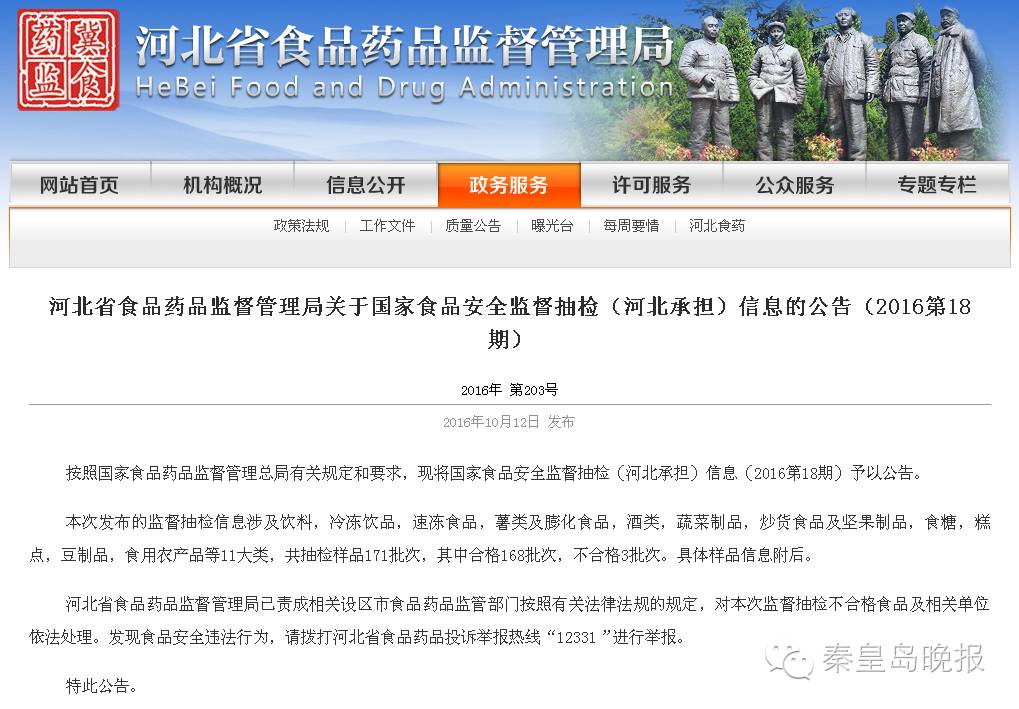 近日,河北省食药监局发布了2016年第18期食品安全监督抽检信息公告,在抽查的171批次的食品样品中,3批次不合格。