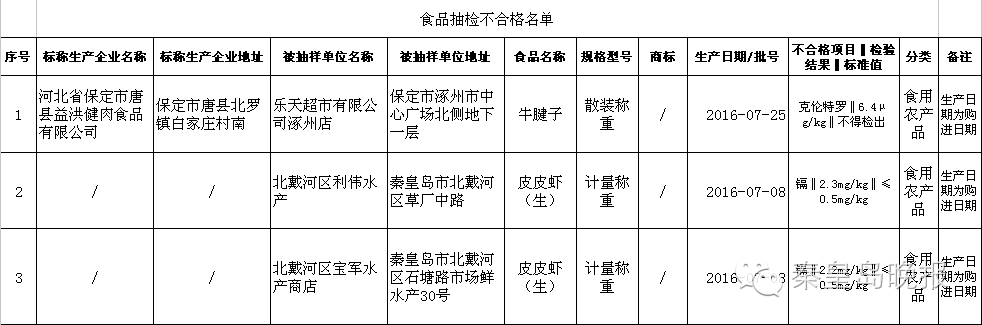 河北省食药监局本期发布的监督抽检信息涉及饮料,冷冻饮品,速冻食品,薯类及膨化食品,酒类,蔬菜制品,炒货食品及坚果制品,食糖,糕点,豆制品,食用农产品等11大类,不合格的3批次样品中,包括北戴河两批次皮皮虾和涿州一批次牛腱子。