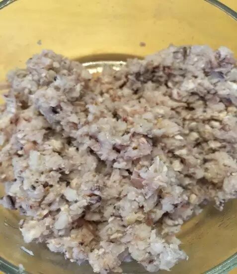 ① 皮皮虾上大火蒸3~5分钟,晾凉,摆整齐放到冰箱冷冻一下(方便去壳),剥下皮皮虾的肉,剁碎备用。