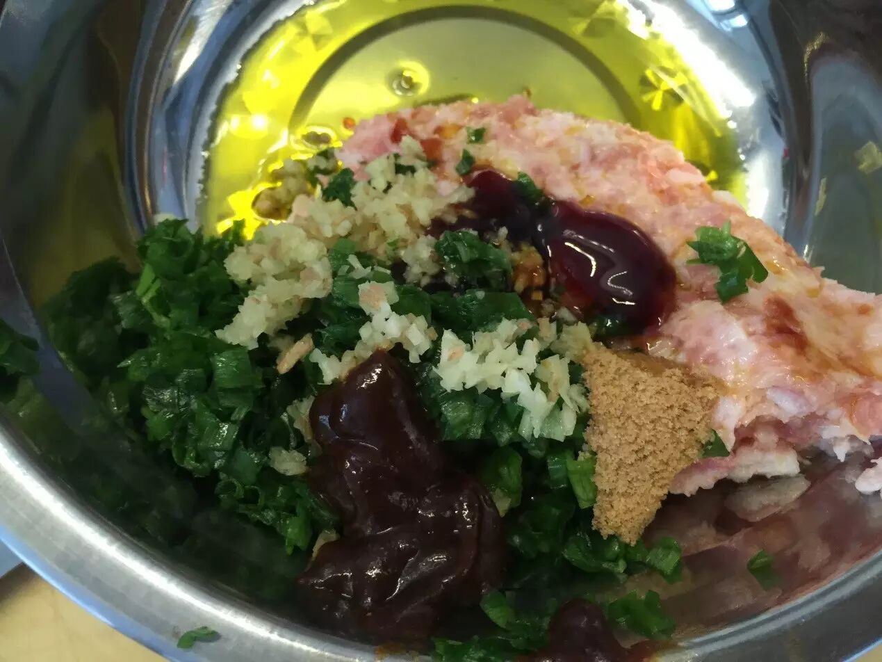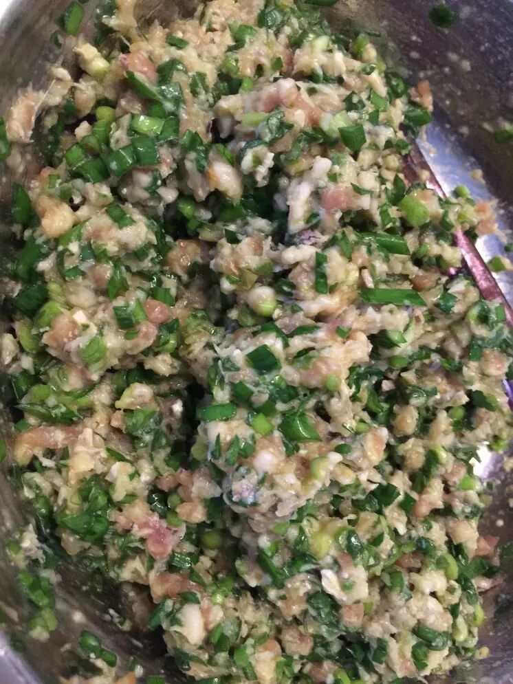 馅料:皮皮虾肉250g,猪肉250g,韭末250g,姜末5g,葱末10g,盐5g(一茶匙),料酒15ml(一汤勺),蚝油15ml(一汤勺),熟油30ml(两汤勺),甜面酱5g(一茶匙)牛肉粉5g(一茶匙),花椒水20g(20粒花椒,小半碗开水泡2个小时)。