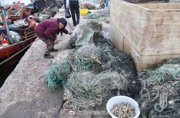 大娘用剪刀把缠在皮皮虾身上的网线剪断,以取下上面的皮皮虾,当地渔民对此也习以为常,因为这样的网处理起来非常麻烦,根本没有再回收的必要了。从网上摘下来的,少数还活着,大多数都已经死亡,因为是刚刚从渔船上下来的,所以吃的时候并不会有啥危害。