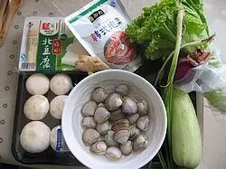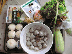 1、正准备好原料,蛤蜊提前半天浸泡,水中加适量油辅助蛤蜊吐沙。文