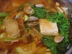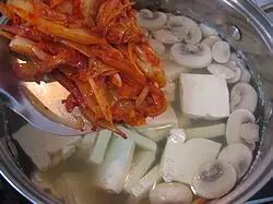 4、加入炒好的辣白菜洋葱、姜片、香葱放入豆腐锅里同煮。