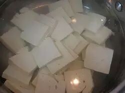 3、锅里加水,烧开后加盐,加入豆腐块,小火炖煮。