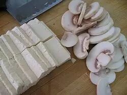 2、豆腐、口蘑切片,西葫芦切片、洋葱切丝。
