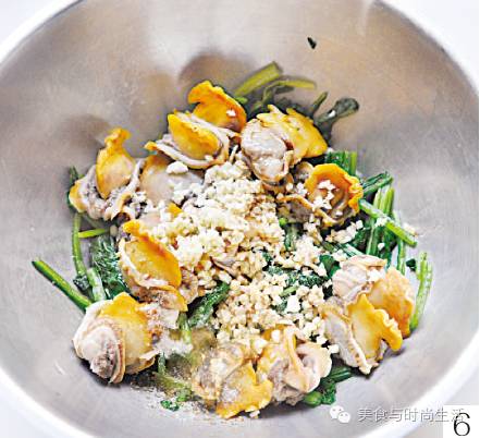 5.菠菜沥水切4厘米长的段,大蒜切末,放入蛤蜊肉。