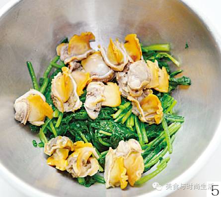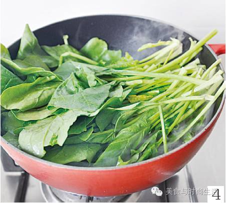 3.如果想保持菠菜翠绿的色泽,可以在汆菠菜时加几滴色拉油。