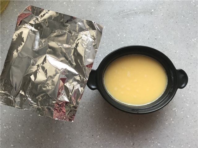 5.蛋液过筛后,用锡纸盖住容器,避免水蒸气进入。