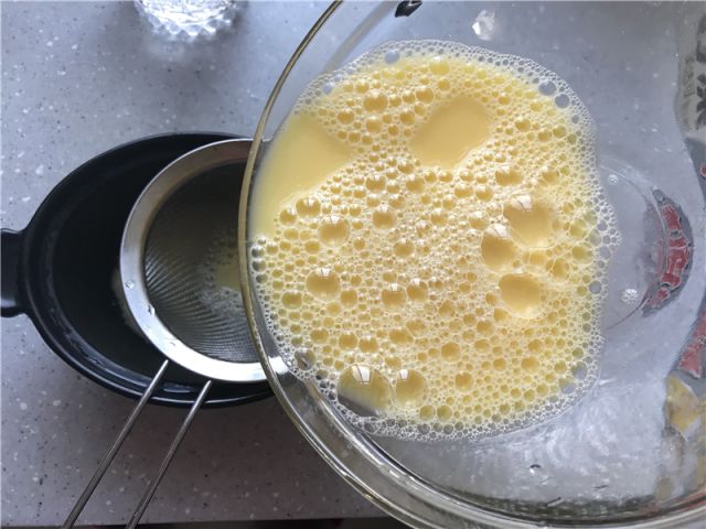 4.蛋液加水打匀,然后过筛倒入容器内,过滤掉气泡。这一点很重要,否则蒸出的蛋羹皱巴巴的样子,就变成蒸蛋羹里的“矮矬穷”啦!