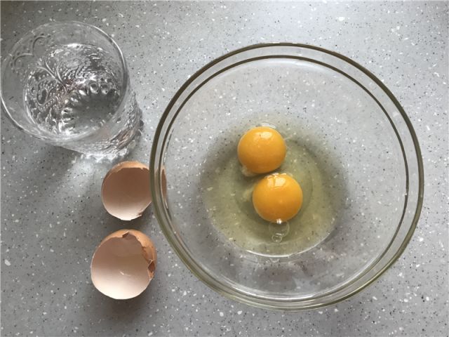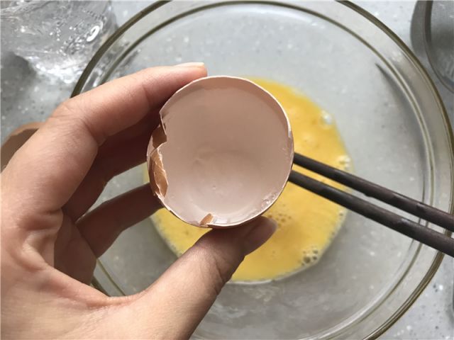 3.准备一碗温开水,水温40度左右即可。蛋液打散后,我放了4蛋壳水。蛋液和水的比例很重要,可根据经验自行调整。