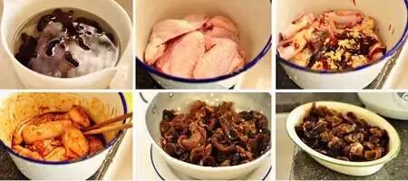 2、把黑木耳洗净,沥干水分,撒一丁点儿盐用手抓匀(不要放多了哦,咸了就束手无策了,因为腌鸡的汁儿有多余的,蒸的时候可以让黑木耳入味,所以这里放盐只是放一丁点儿);铺在盘子底部;