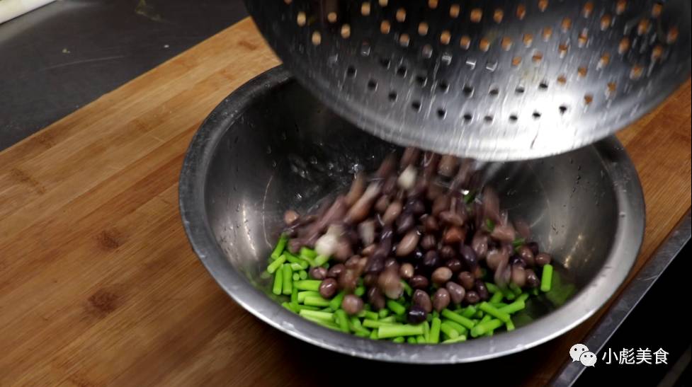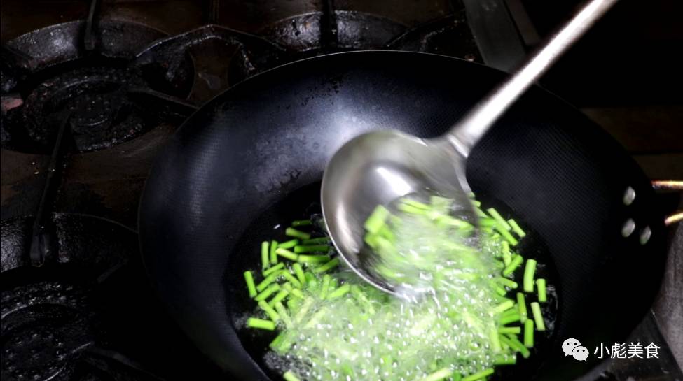 6、锅中倒少许水、水开之后、倒入蒜薹焯水、焯至蒜薹变色就可以、用漏勺捞出来。捞出来、用凉水稍微过下凉。