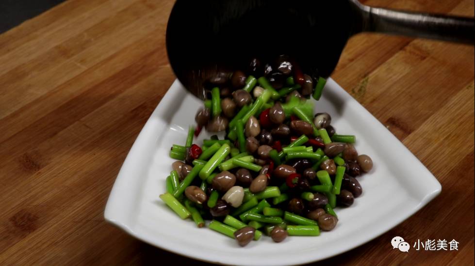 9、放入蒜薹、放入花生米、切好的小米辣。