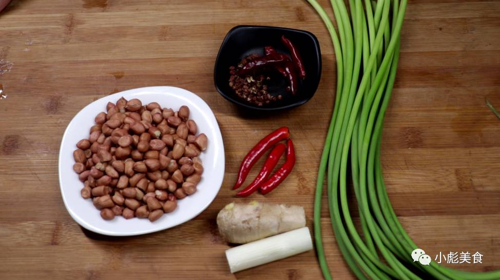 原料:蒜薹、八角、干辣椒、花椒、小米辣、葱姜、花生米