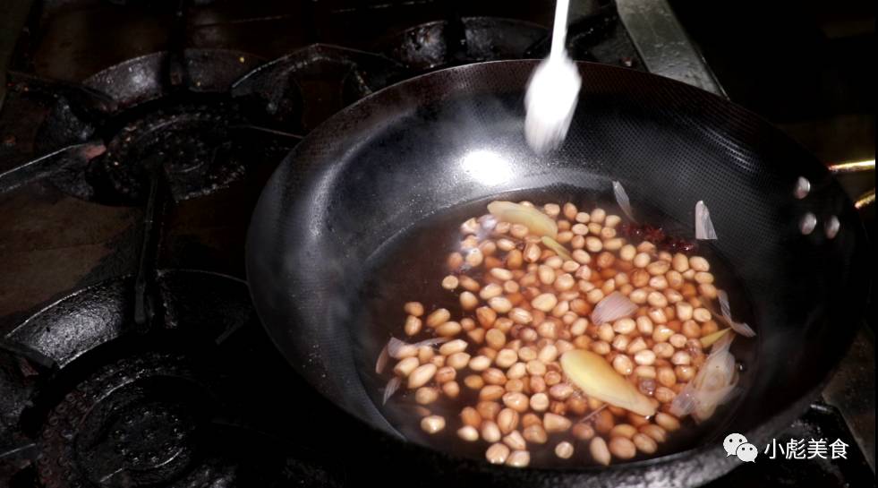 4、锅中倒入水、放入两片葱姜、八角。下入花生米