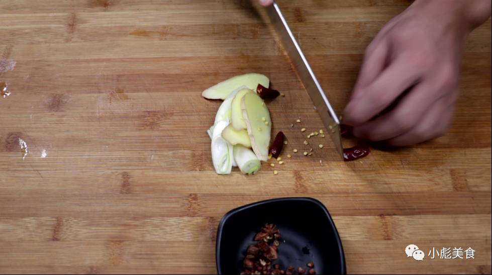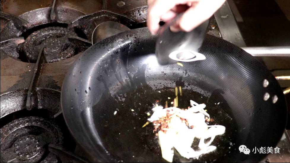 7、锅中倒入少许油、放入葱姜、花椒、八角、小火将料炒香、将料打出来