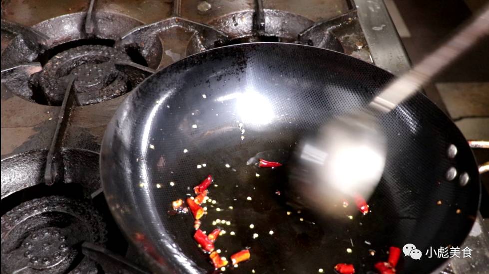 8、再放入干辣椒、把干辣椒炸香、炸至变色就可以啦。