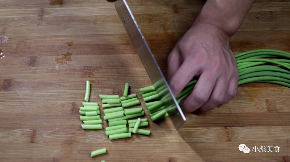 1、蒜薹码整齐、把头切掉、切成小段就可以、不要太长。