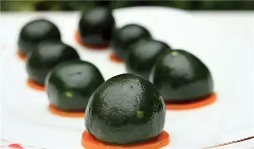 揪下艾草嫩叶,捣成汁,揉入糯米粉,做成碧绿团子,馅心用细腻的糖豆沙制成,包馅儿时,另放入一小块糖猪油。团坯制好后,入笼蒸熟,出笼时将熟菜油均匀地刷在团子表面,大功告成!